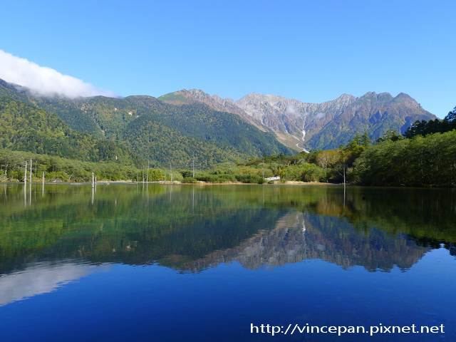 大正池湖面上映著穗高連峰的倒影,山頭上一抹白雲,這是仙境嗎?